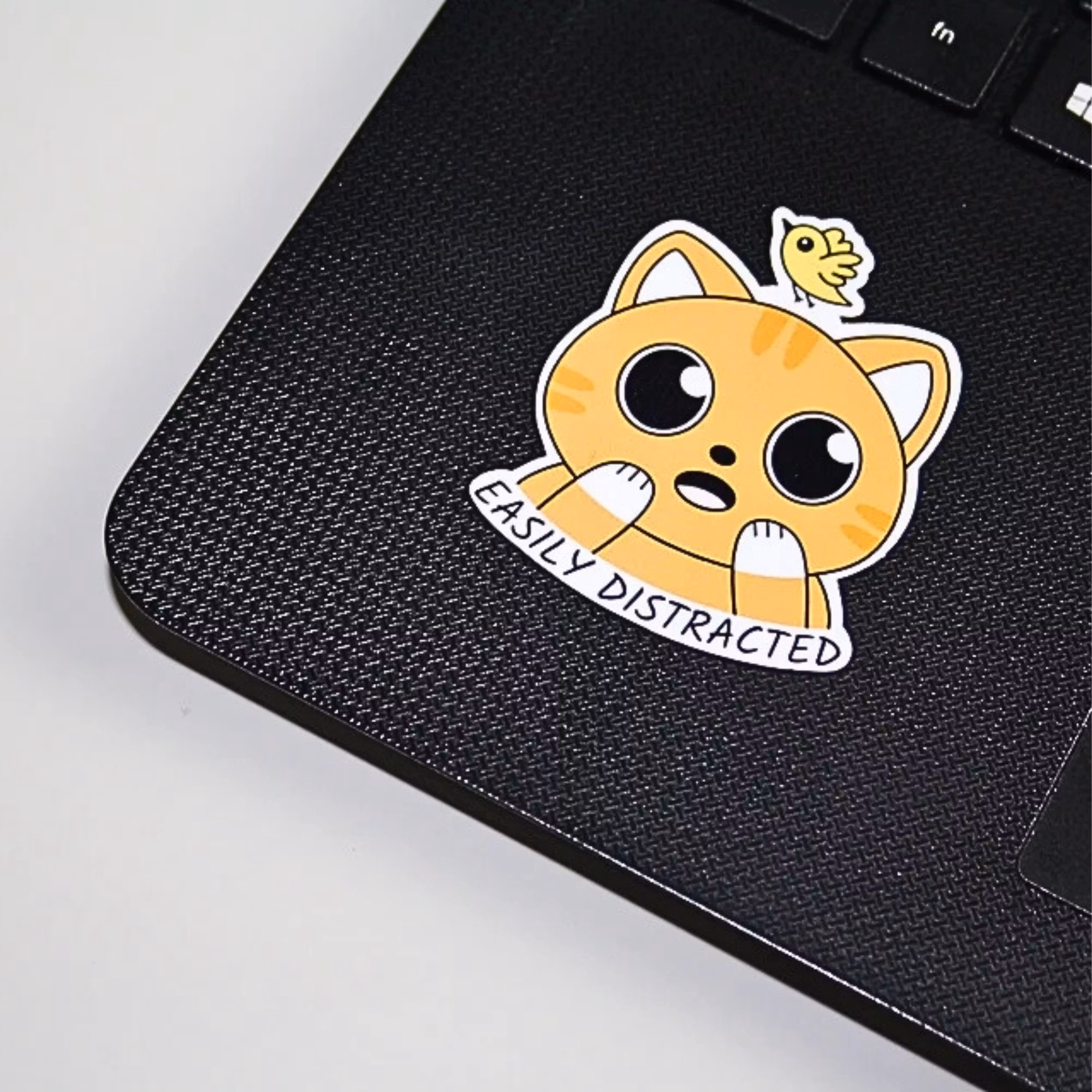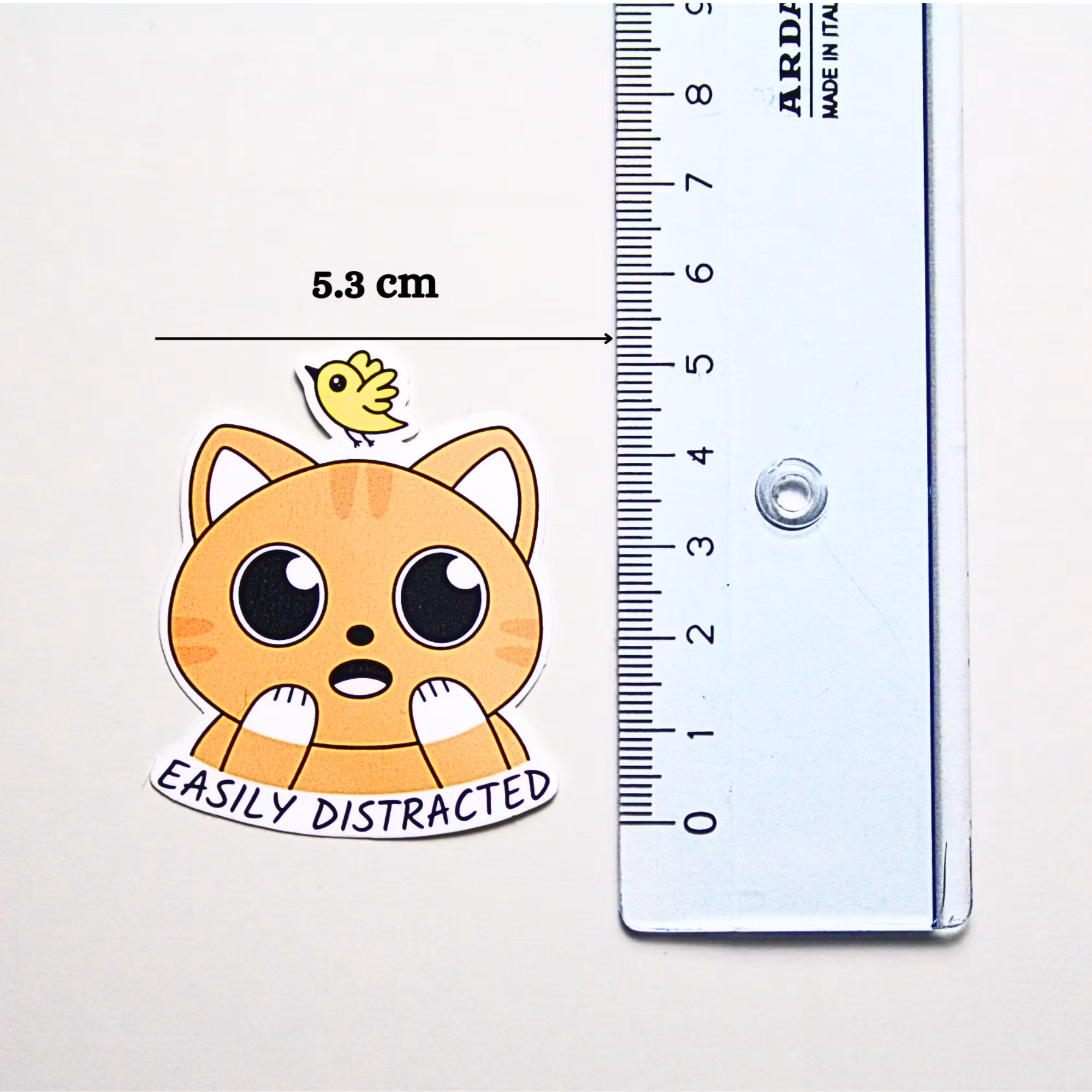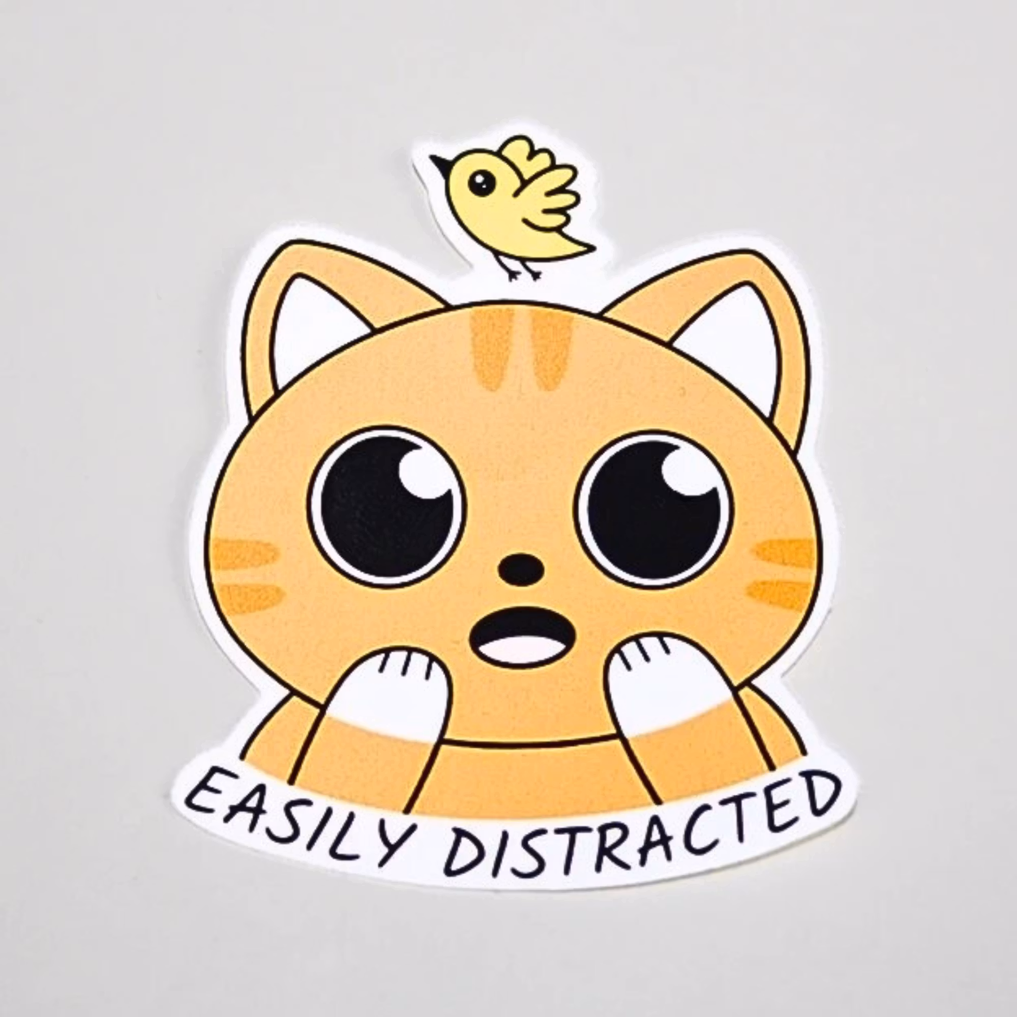 Denne kat indfanger følelsen af at miste fokus - når tankerne vandrer, og verden suser forbi. Et sødt og legende klistermærke, som mange mennesker kan relatere til.